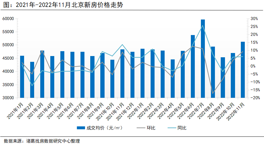11月份,在北京朝陽、海淀部分改善盤熱銷的帶動下,整體新房價格水平進一步走高,且同環比漲幅較上月雙雙走闊。根據諸葛找房數據研究中心監測數據顯示,2022年11月,北京新房成交均價為51250元/㎡,環比上漲9.14%,環比升幅較上月擴大5.61個百分點;同比上漲5.97%,同比升幅較上月擴大0.34個百分點。