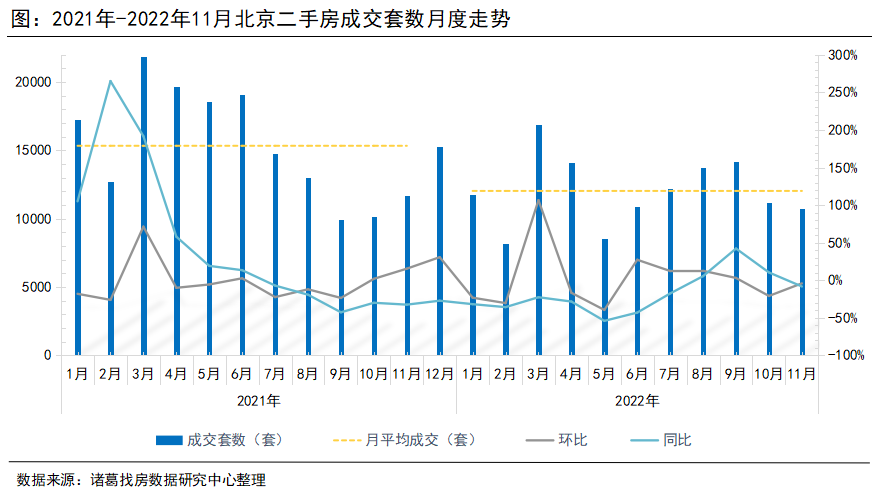 進入11月份,受疫情加重影響,北京二手房市場活躍度同樣有所下降,二手房成交規模進一步下滑,同比時隔3月再度下跌。另外,由於上半年二手房成交動力偏弱,當前累計成交量不及去年同期水平。根據諸葛找房數據研究中心監測數據顯示,2022年11月北京二手住宅成交10750套,環比下降4.09%,環比降幅較上月收窄16.76個百分點;同比下降8.26%。2022年1-11月北京二手住宅累計成交132443套,較去年1-11月下降21.54%。隨着疫情好轉,預計年底北京二手房成交有望上升。
