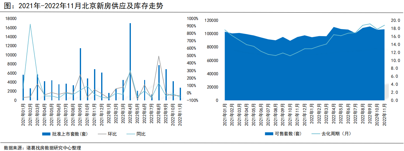 11月份,北京新房供應端持續收窄,供應規模連續3月下降。根據諸葛找房數據研究中心監測數據顯示,2022年11月新房批准上市套數2810套,環比上月下跌33.4%,環比跌幅較上月收窄5.22個百分點;同比下跌59.3%,同比跌幅較上月擴大46.9個百分點。同時,在去化動力明顯減弱的影響下,本月庫存量微升,且高於去年同期水平,數據顯示,2022年11月北京新房庫存量為106760套,環比微升0.63%;同比上升12.2%,同比升幅較上月收窄6.31個百分點。從去化週期來看,11月去化週期為18.8個月,較上月增加1個月。