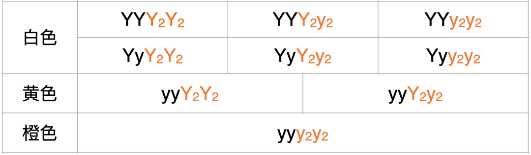 因為大多數胡蘿蔔的類胡蘿蔔素合成,可以看成由兩對等位基因控制(只是可以看成,實際要複雜得多),分別是 Y 基因和 Y2 基因,這兩對等位基因會出現如下三種情況: