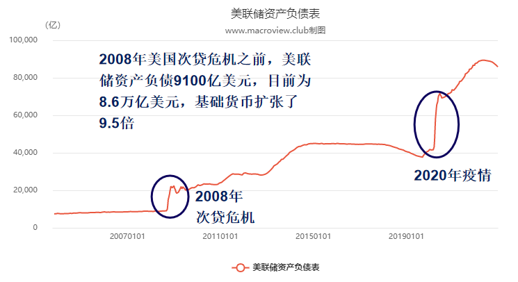 2008年,美國發生次貸危機,開動印鈔機;2020年疫情發生,美國再次開動印鈔機……在短短的十幾年時間內,美國的基礎貨幣擴張了近十倍!