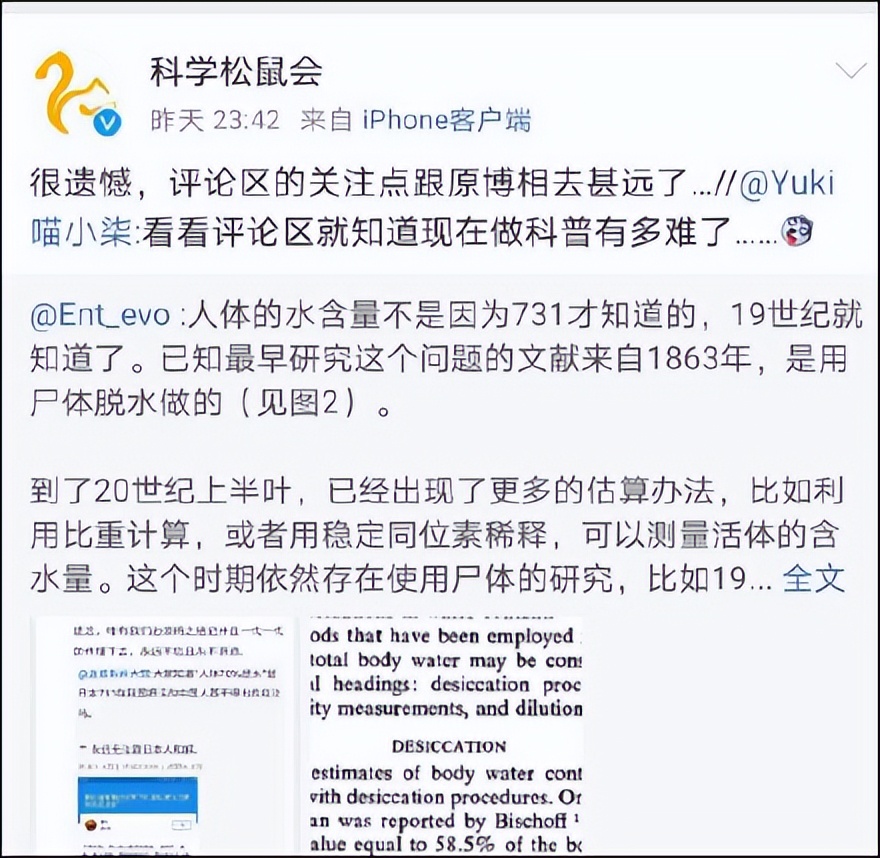 微博科普大 V、科學松鼠會成員@Ent_evo 發文為“人體 70% 是水是日軍 731 部隊把活的中國人蒸乾得出的結論闢謠一事可謂是大跌眼鏡。