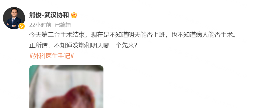 “幾個病人也發微信,告訴我他們陽了的消息。囑咐他們多喝水,多休息,熬過這一波。”熊俊在微博寫道,“今天第二台手術結束,現在是不知道明天能否上班,也不知道病人能否手術。