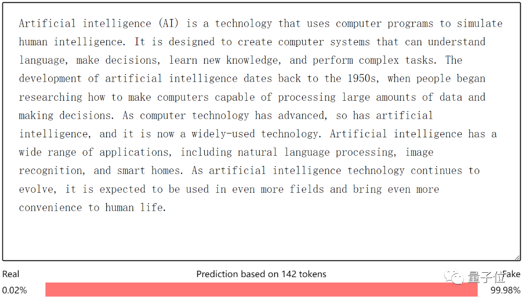 像這樣輸入一段看起來沒毛病的筆記,經過它一番檢測,認為這段文字“由AI編寫”(Fake)的可能性為99.98%!