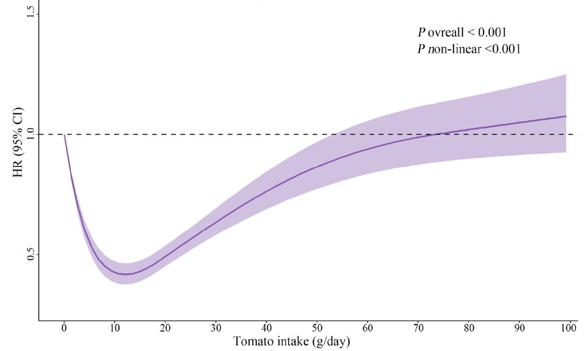 研究發現,與不吃西紅柿的參與者相比,西紅柿攝入量與新發高血壓之間存在“J形”關係。隨着西紅柿攝入量的增加,新發高血壓風險分別降低 58%、49%、18%。