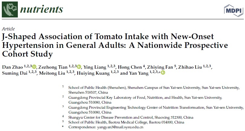 2022年11月,中山大學的研究人員在國際著名營養學期刊《營養》(Nutrients)上發表了一篇研究顯示,西紅柿攝入量與患高血壓之間存在一定關係,每天攝入10-13克西紅柿,高血壓風險最低。①