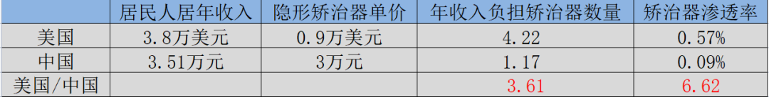 美國居民購買力遠高於我們,但隱形矯治器行業滲透率依然僅為0.57%,因此我國隱形矯治行業滲透率低其實是符合邏輯的。儘管美國隱形矯治器的滲透率是我國的6.62倍,但考慮到3.61倍的購買力差距,我國隱形矯治器行業的天花板實則被大幅拉低。