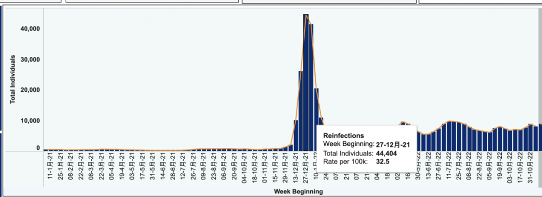 但值得注意的是,根據英國的數據,93.4%的重複感染都發生在奧密克戎流行後。而紐約州的“重複感染趨勢圖”則同樣顯示,這種情況始於2021年底。