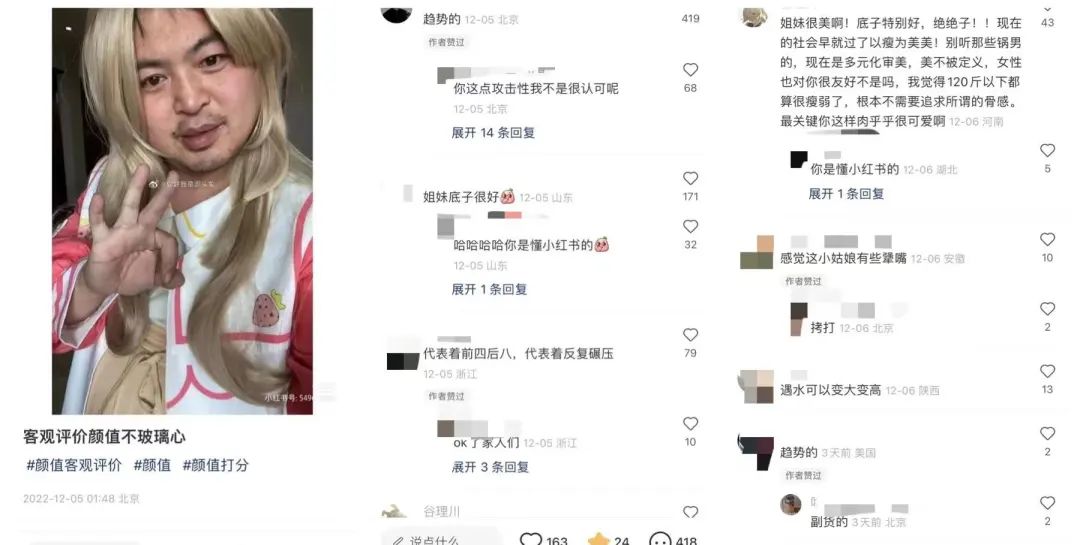 除此之外,部分男性用户也會主動“進攻”小紅書,他們會主動“反串”,發佈一些並不屬於本人的照片去製造一些戲劇效果,解構社區中原本的和諧場面。亦或者將一些女性用户並不瞭解的抽象網紅的照片搬運至小紅書,以當事人的口吻求打分,希望看到有不明所以的女性用户被釣魚,最終給出一個奇特的評價,成功達成引戰的效果。