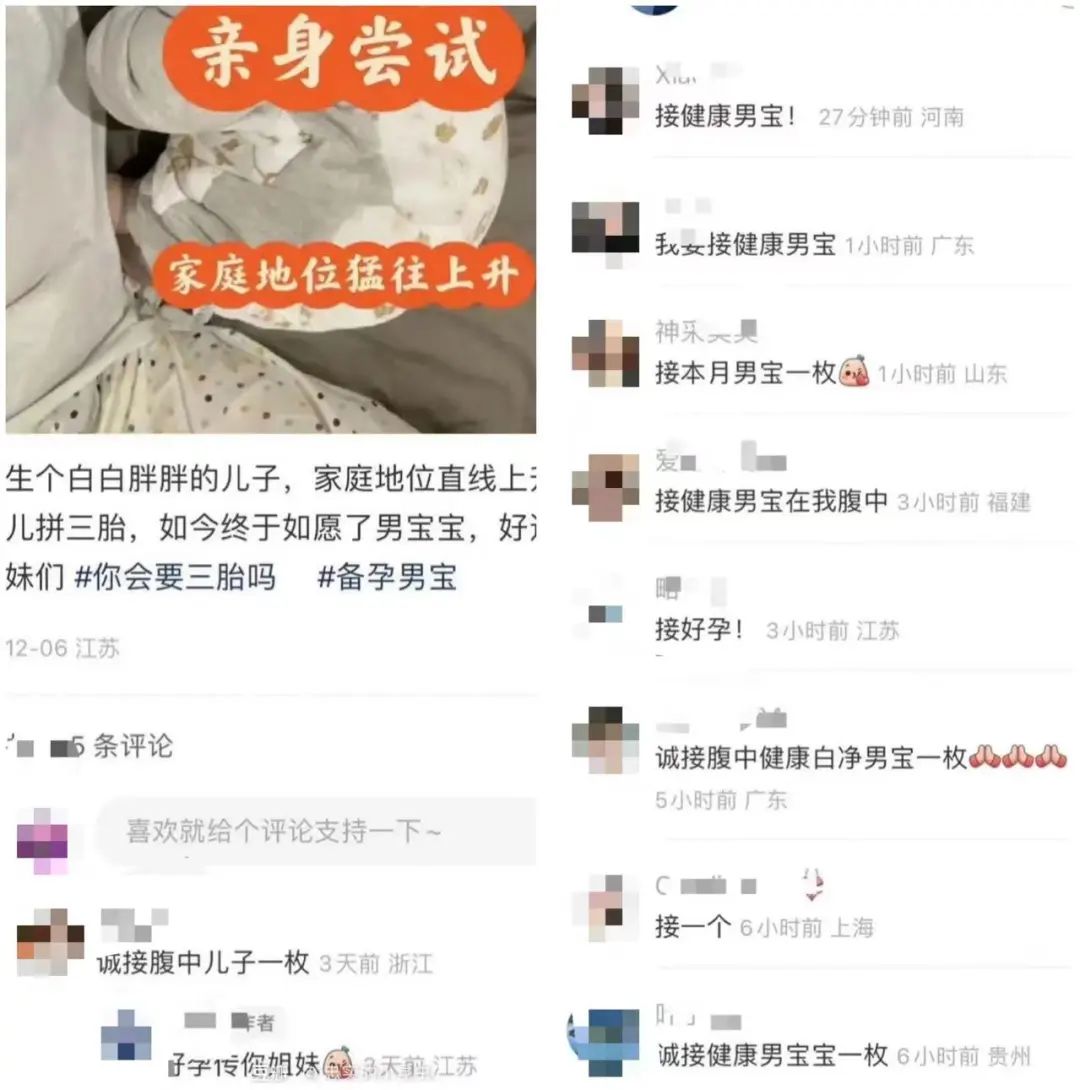 一些頗為荒誕的對話也可以在互聯網上看到,當一位孕婦曬出自己的照片並得到“祝你生個女孩”的評價後,她激動且憤怒地回懟道:“你就不配做個女人。”而一旦有人曬出自己最終生下了男孩的照片,就會有大批量的孕婦同時在評論區下“接男寶”,場面蔚為壯觀。