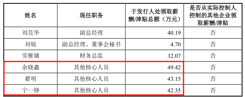 其中,2020年招股書上會稿顯示其他核心人員薪酬分別為,餘曉鑫49.42萬元、翟明43.15萬元、寧一錚42.35萬元,除去這三人的薪酬剩餘的屬於關鍵管理人員薪酬,合計為655.03萬元,但是在關聯交易的經常性關聯交易中,關鍵管理人員薪酬為677.26萬元。