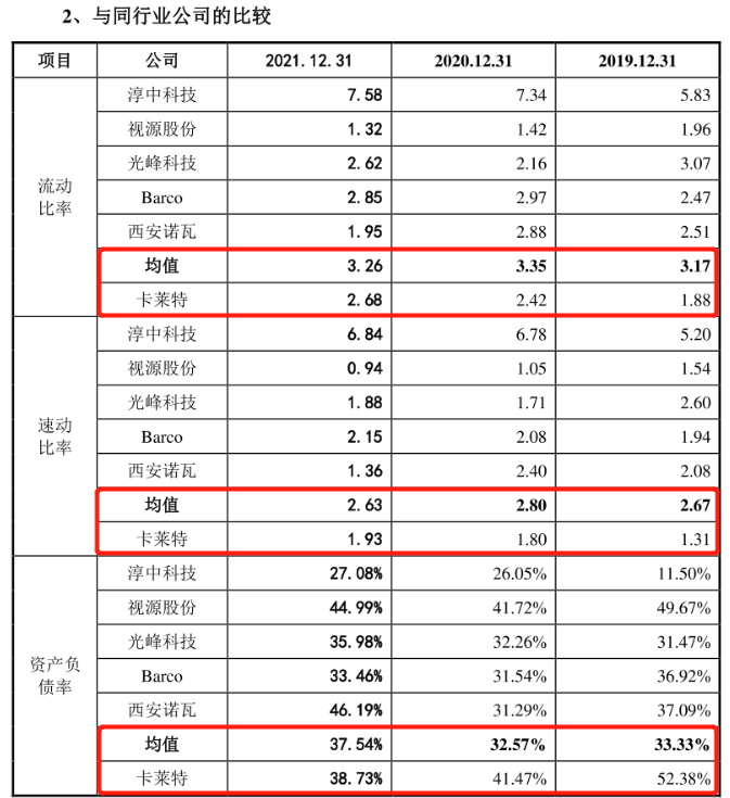 各期末,卡萊特流動比率分別為1.88、2.42、2.68,速動比率分別為1.31、1.80、1.93;而同行業可比公司的流動比率均值分別為3.17、3.35、3.26,速動比率均值分別為2.67、2.80、2.63。可以看到,該公司的流動比率和速動比率均明顯低於行業均值。但相反的是,卡萊特的資產負債率卻明顯高於可比公司均值。數據顯示,該公司報告期內資產負債率分別為52.38%、41.47%、38.73%;可比公司資產負債率均值分別為33.33%、32.57%、37.54%。卡萊特多項指標不及同行,短期償債能力較差。