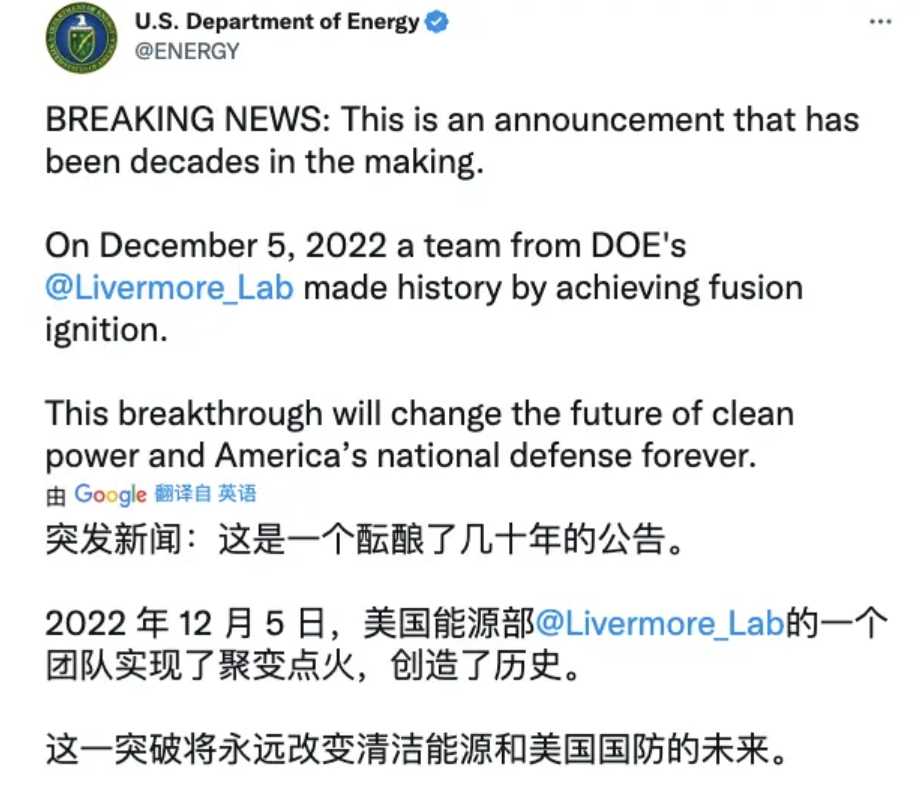 美國能源部週二宣佈,其下屬勞倫斯利弗莫爾國家實驗室(LLNL)的一支團隊實現了“核聚變點火”,創造了歷史。於是國內的一眾媒體又紛紛跟進,鼓吹美國科技天下無敵,世界燈塔人類希望。