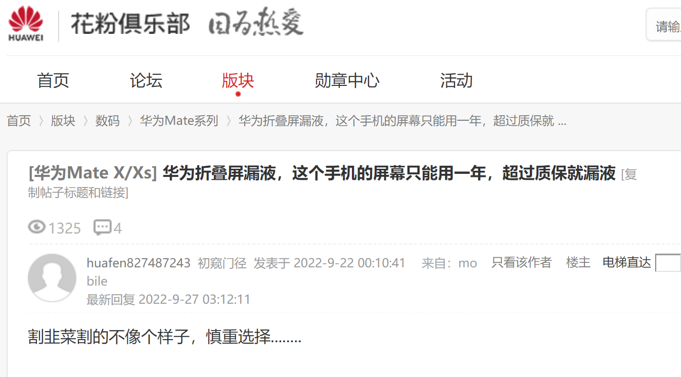 在華為論壇和花粉俱樂部上,關於華為摺疊屏問題也非常多。甚至有用户發帖稱“4個月換了5次屏”。
