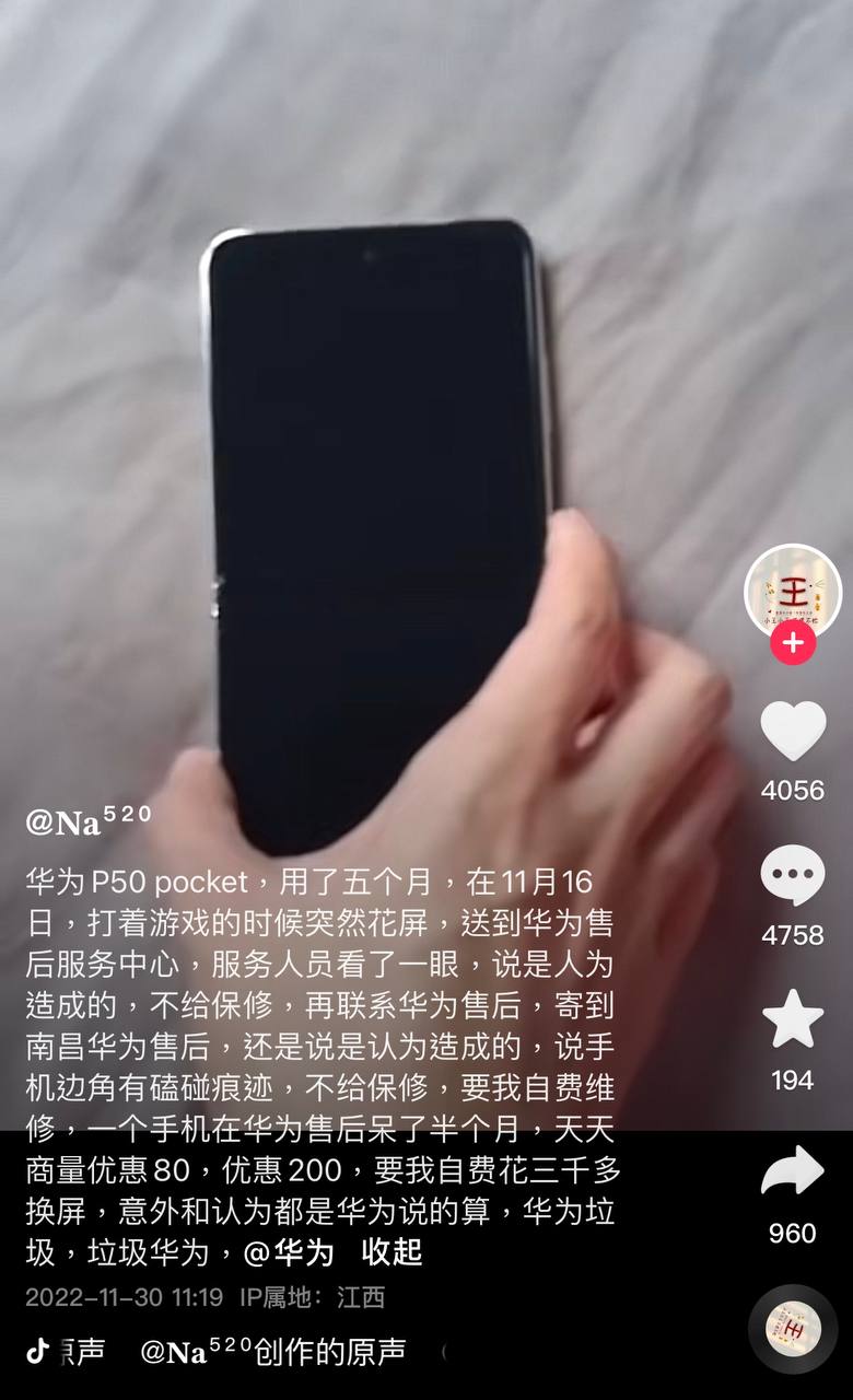 11月30日,有用户在抖音投訴稱,華為P50pocket摺疊屏手機才用了5個月,在打遊戲過程中出現花屏,華為售後稱是人為因素導致,無法保修,要求自費維修。