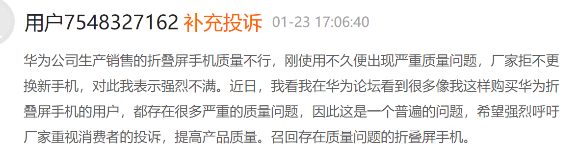 在互聯網消費者投訴平台黑貓上,關於華為摺疊屏的投訴有282個,其中大部分是摺疊屏質量問題。涉及華為P50pocket、mate xs2等機型。主要投訴問題為漏液導致花屏、有摺痕,屏幕有光斑、黑點等。
