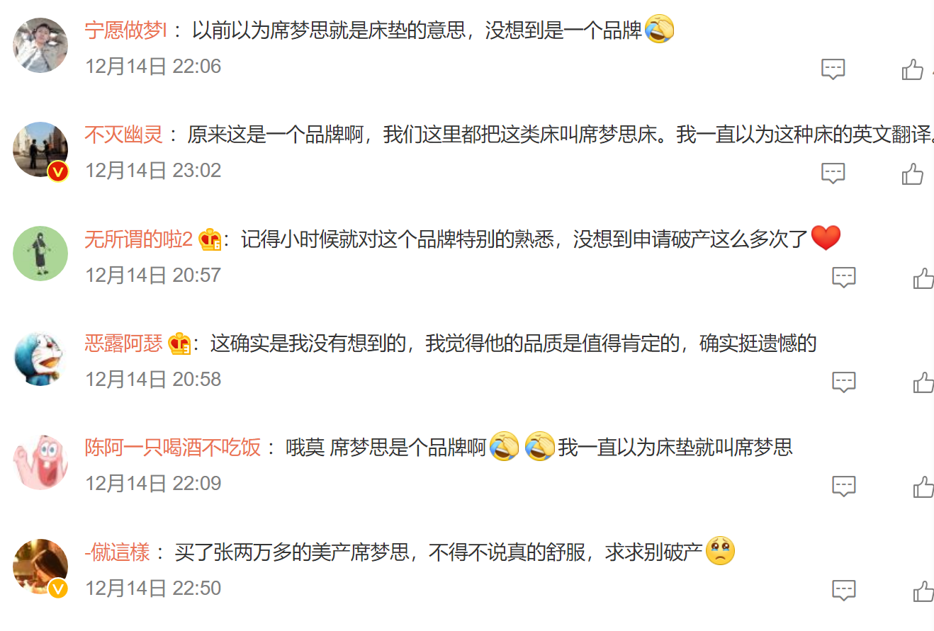 席夢思申請破產一事,也引起了網友的討論。網友紛紛表示,原來席夢思是一個品牌,還一直以為席夢思就是指牀墊。同時,有不少網友也產生了疑問,一個這麼受歡迎的品牌怎麼能走到申請破產這一步呢?