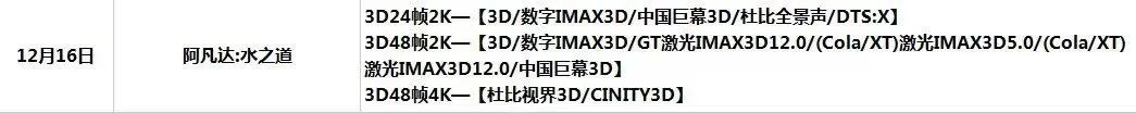 這次《阿凡達2》呢,原始版本是48幀,而支持48幀的有哪些?杜比影院、CINITY,和部分IMAX廳,也就是説,前二者隨便選都是48幀,IMAX則是有24幀和48幀兩種格式。