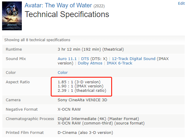原始的《阿凡達2》是什麼樣的?Venice 3D攝像機拍攝,1.9:1的IMAX畫幅,而在目前的影廳中,只有IMAX能夠完整呈現影片的所有畫面,杜比影院和CINITY卻只有2.35:1或2.39:1的寬幅,意味着要裁切掉20%左右的畫面信息。