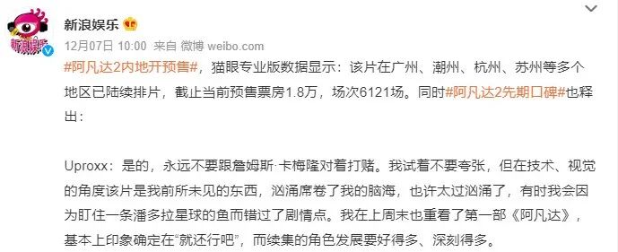 12月10日,《阿凡達2》成功突破一億元大關,成為今年預售最快破億影片。