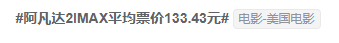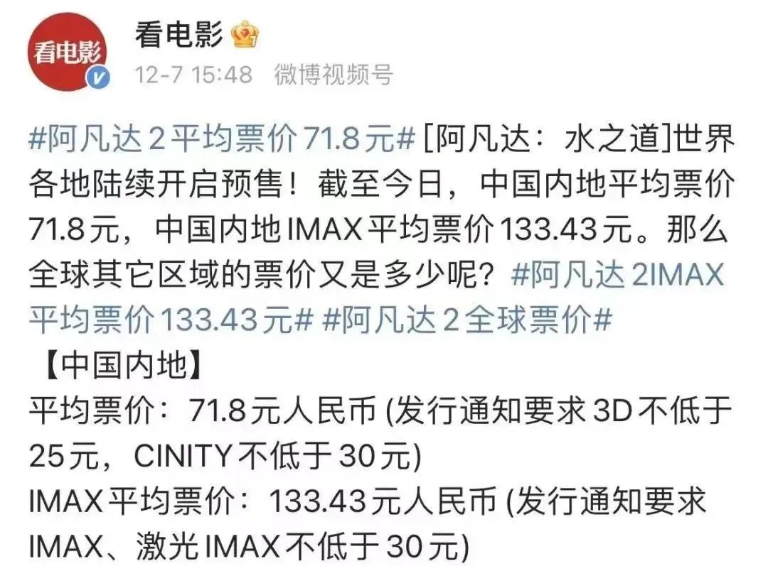 根據微博博主@看電影蒐集的資料,《阿凡達2》全國平均票價為71.8元,IMAX平均票價為133.43元。