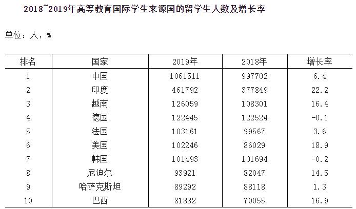2021年在華留學生前10位生源國依次為韓國、美國、泰國、巴基斯坦、印度、俄羅斯、印度尼西亞、哈薩克斯坦、日本和越南。