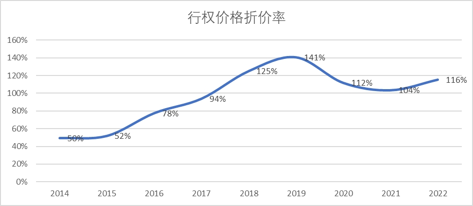 我們統計了2014年以來股權激勵行權價格與當年成交均價的數據發現,折扣費率實際上並不高,自18年開始甚至超過了100%。