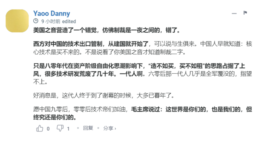 美國之音的留言區不光用來辯論交鋒,也有罵爹罵娘同時直抒胸襟的。比如,有人昨天就在一篇消息後面寫道:“核心技術是買不來的……只是八零年代在資產階級自由化思潮影響下,‘造不如買,買不如租’的思路佔據了上風,很多技術研發荒廢了幾十年。一代人啊。六零後那一代人幾乎是全軍覆沒的,指望不上。好消息是,這代人終於到了謝幕的時候,大多已暮年了。願中國九零後,零零後技術帝們加油,毛主席説過:這世界是你們的,也是我們的,但終究還是你們的。”