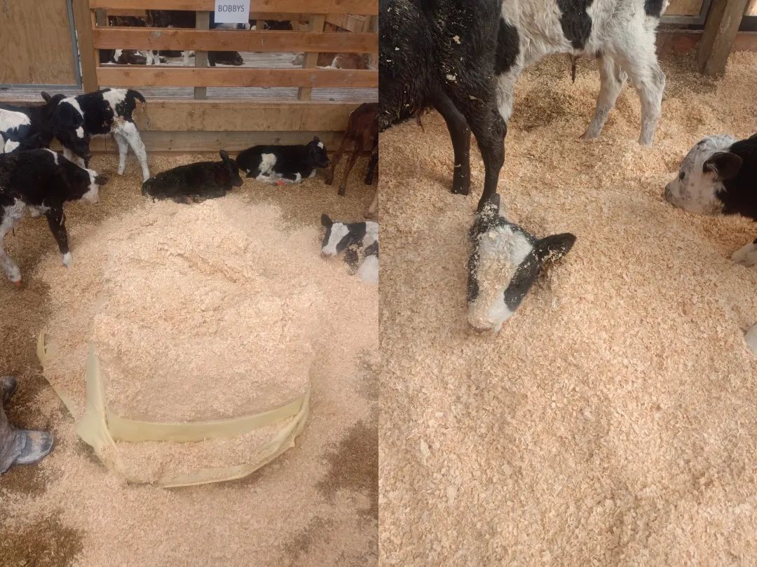 “給小牛換地毯,我把小牛埋在了木屑裏哈哈”