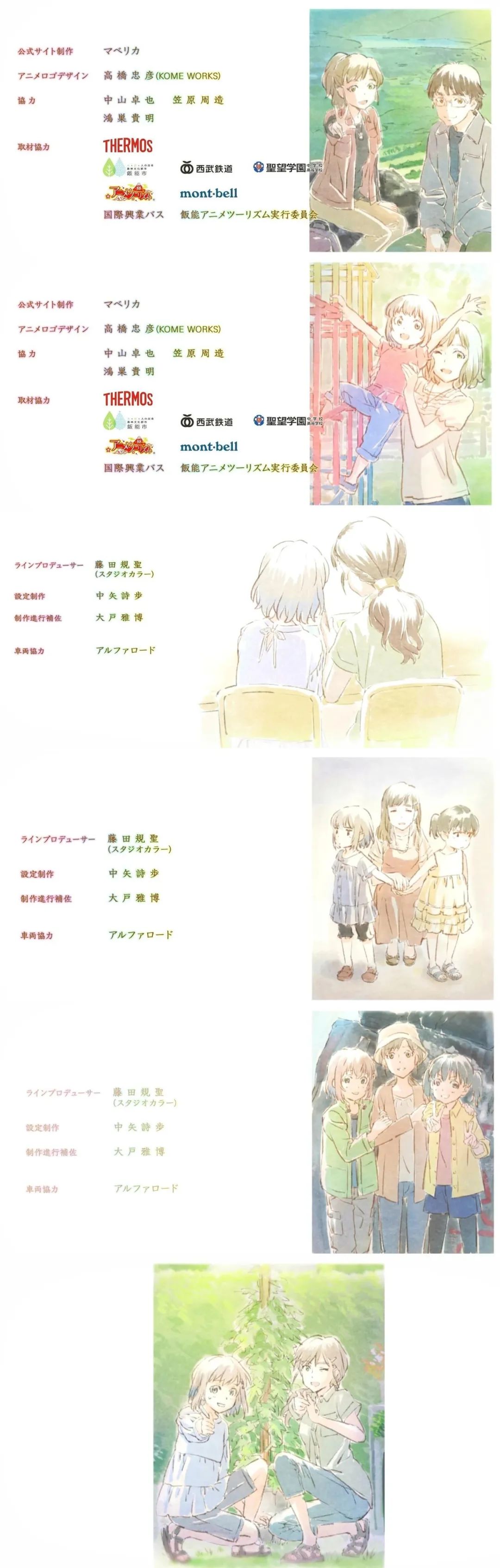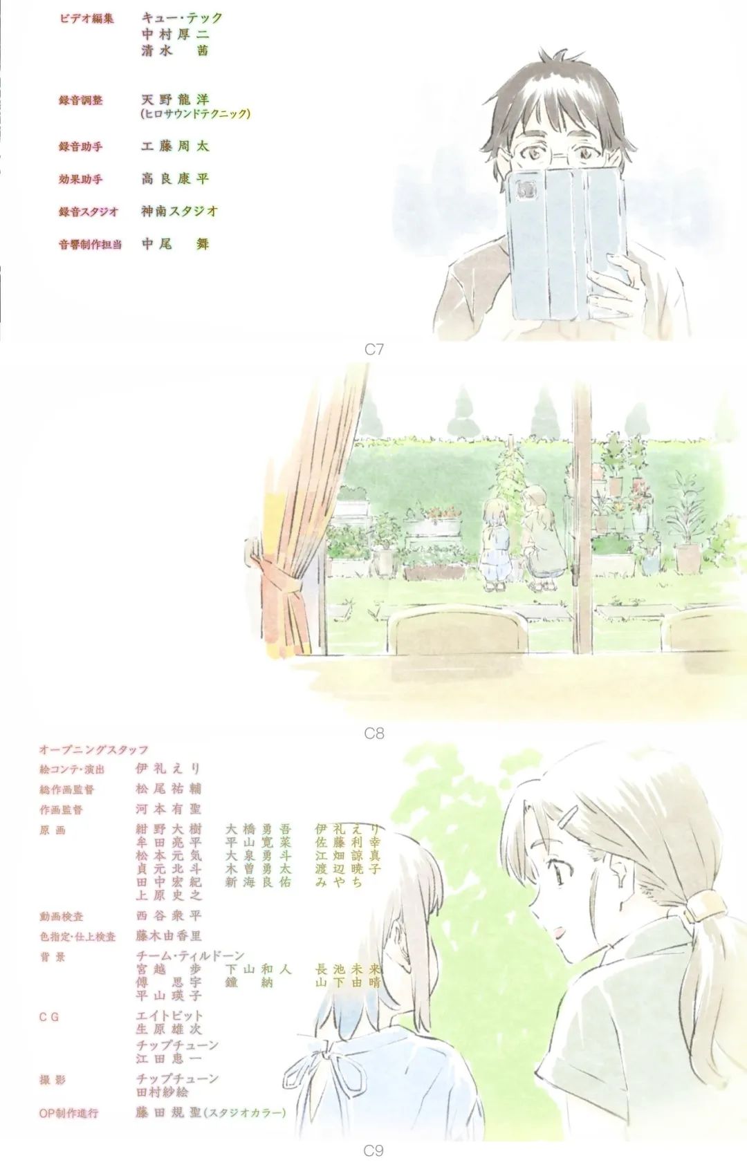 第 8 集的片尾影像也揭示了相似的體驗:這個影像讓已經成為照片形態的時空和正在進行的時空交互穿插。其中,照片通過加上噪點濾鏡來表示出,與正在進行的事件時空區分開來。而開頭結尾兩張由穗香拍的照片下方留白處,都有用鉛筆為這張照片題的名字,開頭一張是葵背向相機看着遠處的雲層與朦朧的城鎮,命名為“雲雪”(くもゆき,C10);結尾一張是葵看着相機立於峭壁前,疾風撩起她的頭髮和衣裳,命名為“立於斷崖”(斷崖に立って,C11)。