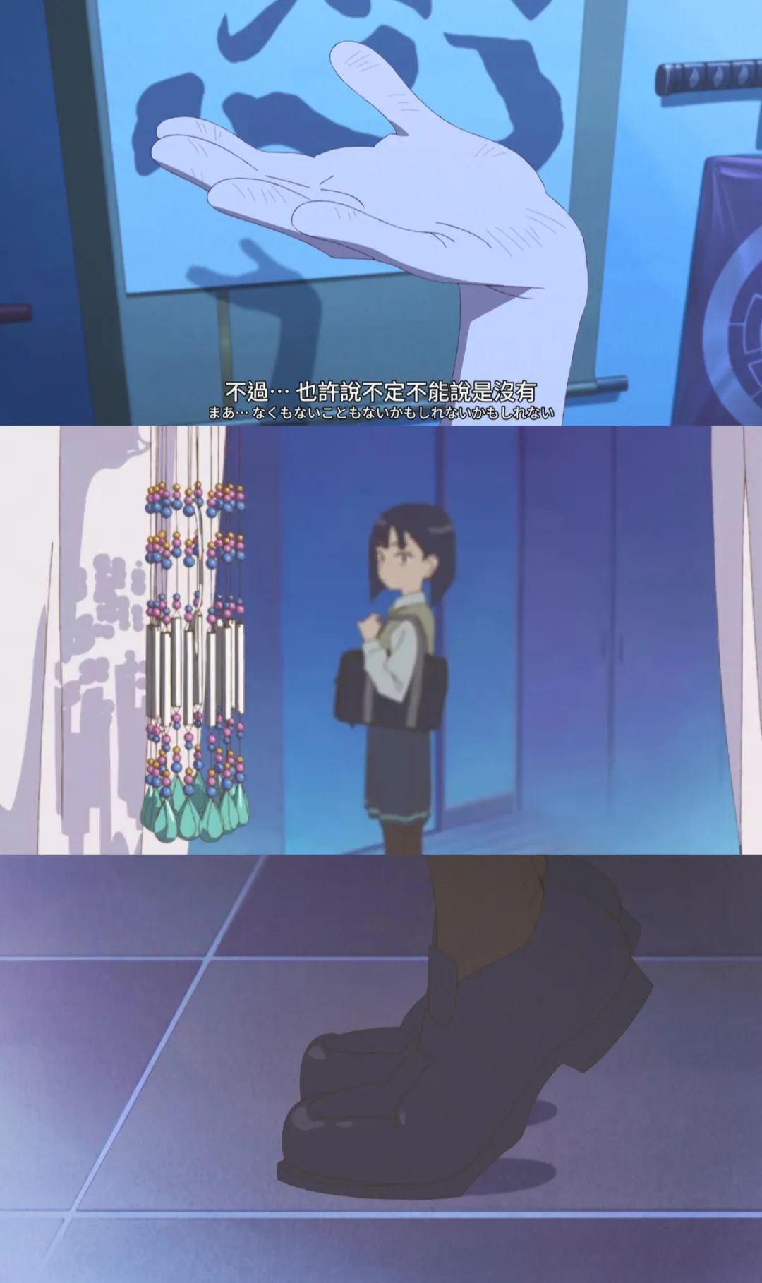 在我看來,在《向山進發 Next Summit》中,解體這些視線的可能性,就存在於片尾影像中,也就是作品內部對某人對少女們投來的、無人知曉的視線。這些影像或是關注了正片花費極少筆墨描繪的配角,如女主角葵的父母親和打工的前輩,或是極少被正面描繪的關係,如葵一家三口的關係、葵和穗香的私人關係。