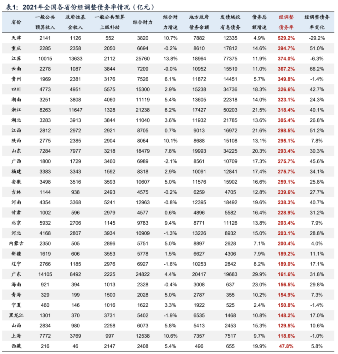 **分別是:天津、重慶、江蘇、雲南、貴州,**最高的城市,負債率達到了529%,這個數字不論是放在個人還是企業,都是數據最高風險的那一檔了