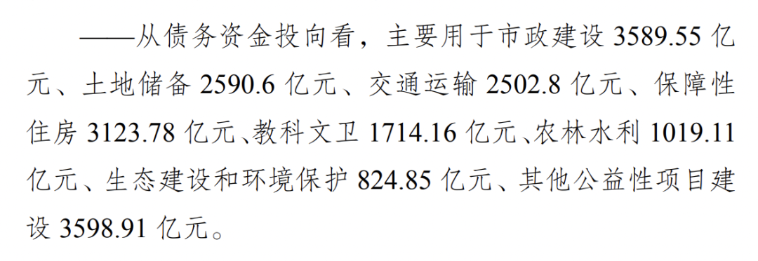 江蘇的債務資金投入主要用於市政建設、土地儲備、交通運輸、保障性住房、教科文衞、農林水利、生態建設和環境保護