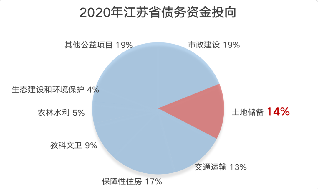 可以看到2020年江蘇省的債務資金投向主要以市政建設、基礎建設、農業、生態科教為主,其中的土地儲備僅僅只有14%
