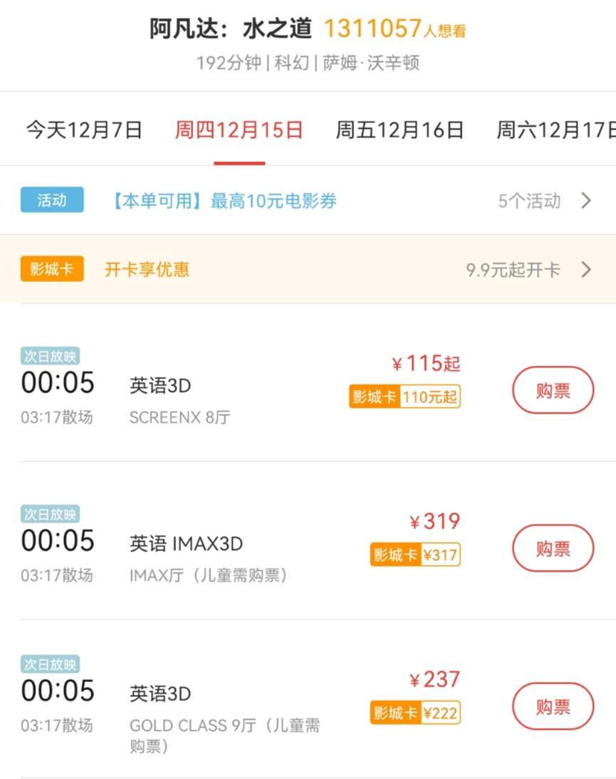 零點場、CINITY點映場等特殊場之後,**事實上迎來了一定的票價回落。**筆者打開票務APP搜索附近影院,大部分普通3D場在七八十元左右,特殊影廳在百元以上。進口片大IP在剛剛上映階段可能存在一定的溢價,這是由市場供需關係決定的,十多年前《阿凡達》也曾高至百元、黃牛加價十倍,《復仇者聯盟4》也引發過高價質疑,在上映兩週後回落。過往李安的《比利·林恩的中場戰事》上映時,因能夠提供4K/3D/120幀技術支持的內地影院只有兩家,稀缺性也曾導致最高320元的票價。