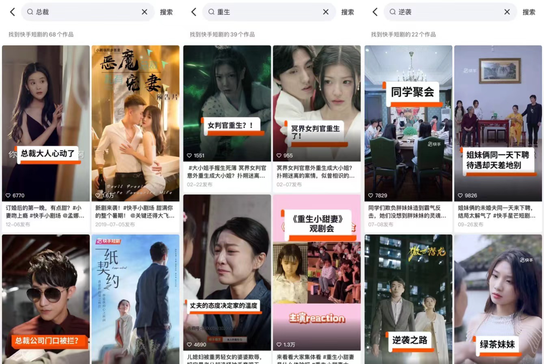 **霸總嬌妻、穿越重生、逆襲等或狗血或甜爽的套路化劇情,正侵蝕着短劇行業。**以快手為例,在快手短劇官方賬號上搜索“總裁”,就有68個搜索結果,“重生”有39個結果,“逆襲”有22個作品。