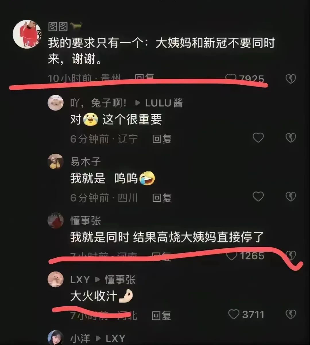 昨天聽到最自黑的一個段子,女孩子們紛紛在求“大姨媽和新冠不要同時來”。有個回覆説:“我就是同時來,結果高燒大姨媽直接停了”。