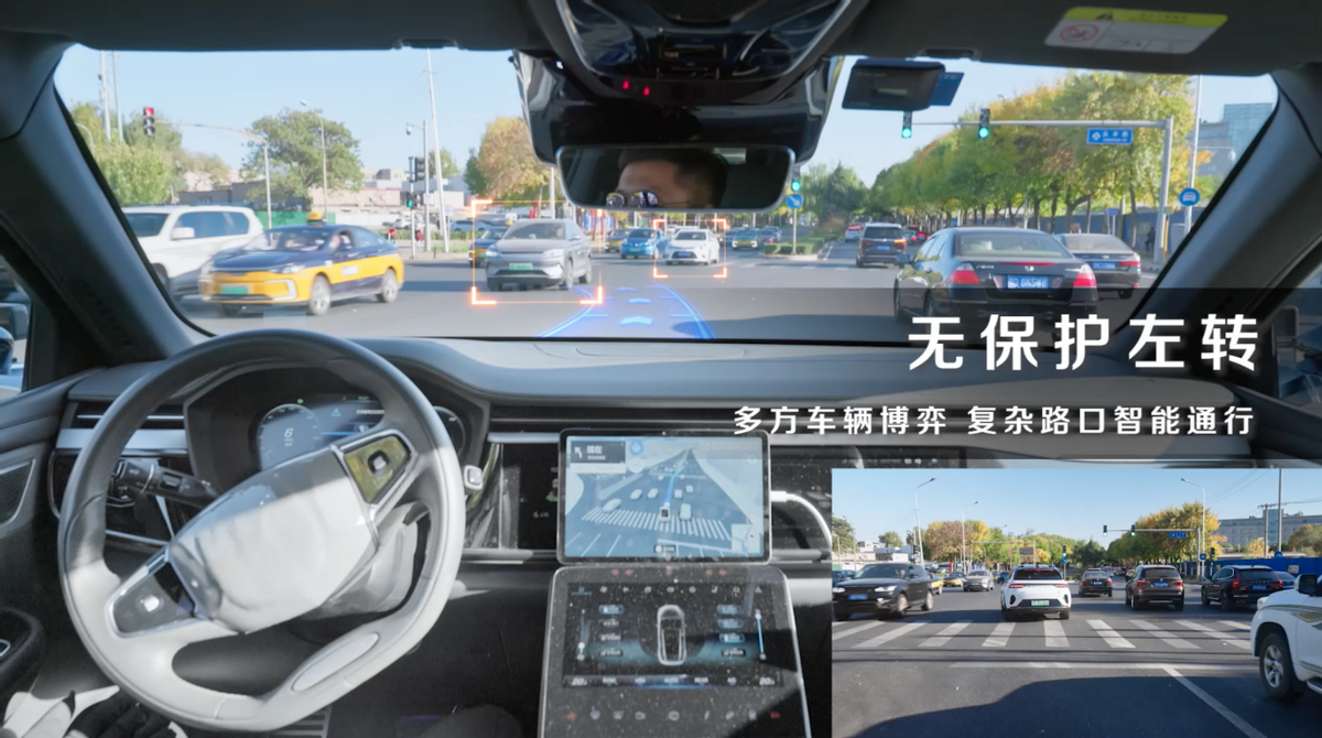 行駛至城市中最具有挑戰性的複雜路口場景時,搭載ANP3.0的車輛精準躲避了路口外賣車“鬼探頭”,並在轉彎過程中與主路直行車輛進行博弈後,實現了無保護掉頭。在沒有專門左轉紅綠燈的無保護路口,搭載ANP3.0的車輛也與對向直行車流博弈成功,完成無保護左轉。