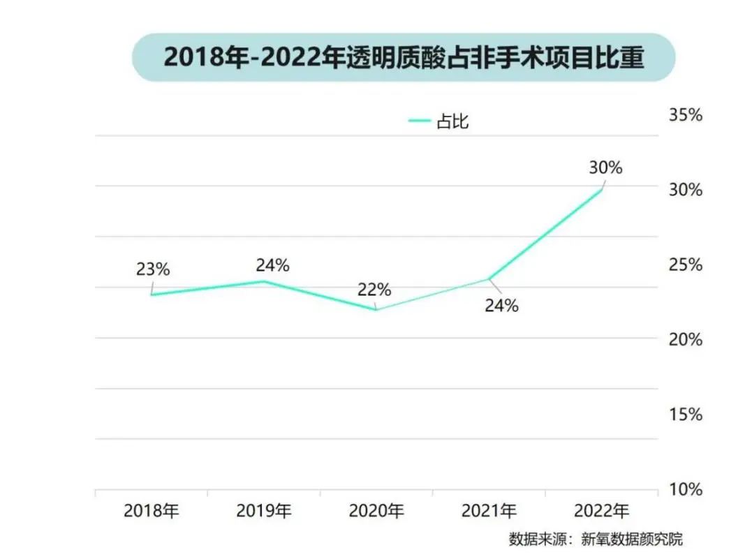 隨着醫美用户需求由“重”(手術類項目)到“輕”(非手術類項目)轉變,透明質酸相關醫美項目佔非手術類項目比重穩步提升。2022年,透明質酸相關醫美項目在非手術類項目佔比提升到30%。