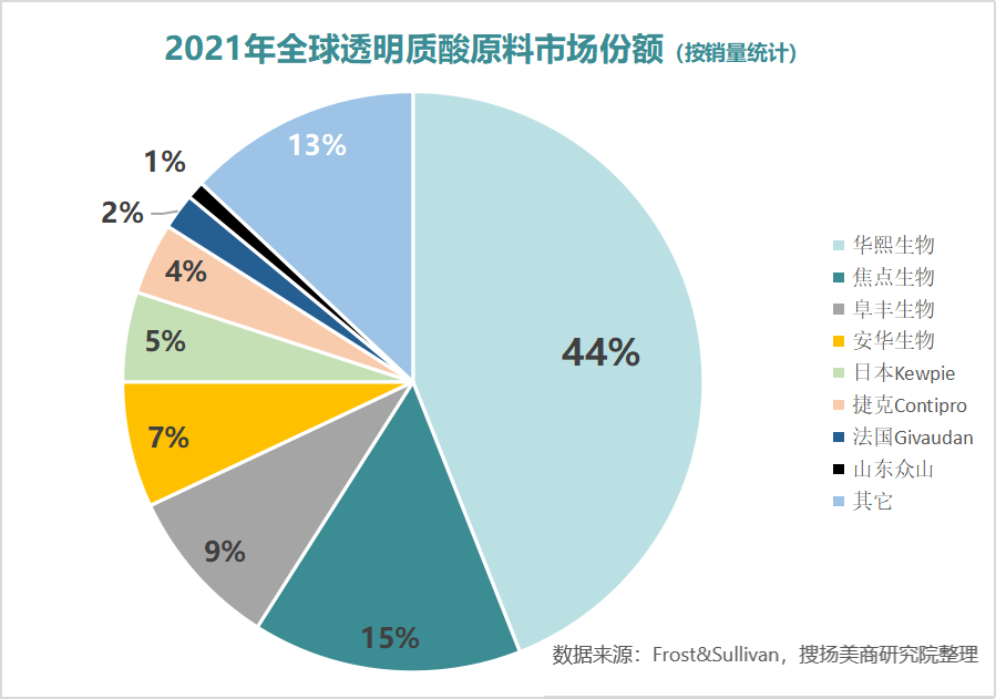 此外,龍頭企業技術壁壘較為深厚,競爭力強勁。以華熙生物為例,數據顯示,中國是全球最大的透明質酸原料“輸出站”,2021年中國透明質酸原料總銷量佔全球銷量的82.0%,而作為中國透明質酸原料供應龍頭企業,華熙生物以44%的全球市場份額領跑全球透明質酸原料市場。