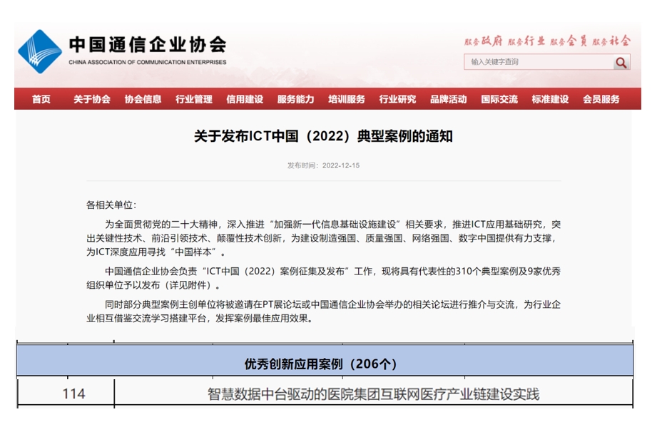 近日,由中國通信企業協會組織的“ICT中國(2022)案例徵集及發佈”活動結果公示,通用技術環球醫療申報的《智慧數據中台驅動的醫院集團互聯網醫療產業鏈建設實踐》榮獲“ICT中國(2022)案例—優秀創新應用案例”。
