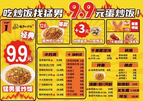 由之前的“中國高品質炒飯創導者”改成了“乾淨,實惠,吃猛男” 。換掉價高品多的菜單,去掉了龍蝦炒飯等貴价產品,降價了一半。