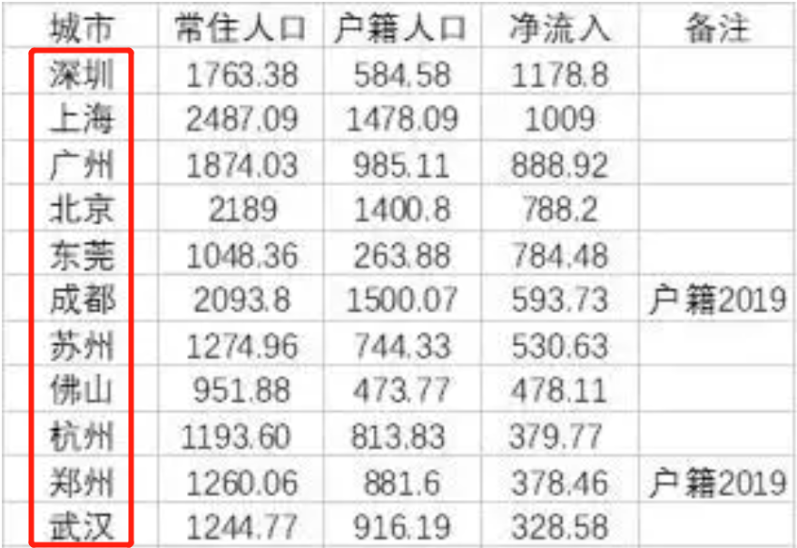 我搜下了人口淨流入全國排名前十的城市都有哪些©第一財經