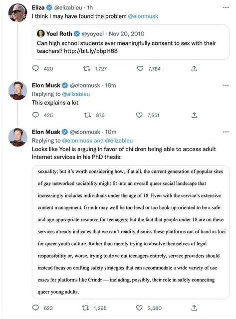 羅斯在論文中建議,像同性戀約會應用Grindr這樣的服務應該採取安全策略,以適應青少年使用他們的平台,而不是將他們完全驅逐出去。馬斯克還評論了羅斯在2010年的一條推特,“對於與老師發生性關係,高中生的態度有意義嗎?”羅斯沒有回答自己的問題,只是鏈接到一篇關於華盛頓最高法院裁決的文章,該裁決認為,該州的一名教師可能因與18歲以上的學生髮生性關係而被判有罪。華盛頓州的法定年齡是16歲,但華盛頓州立法者打算將所有學生的師生性接觸定為犯罪,甚至包括18-21歲的高中生。但馬斯克轉引了這篇推特後,許多評論將羅斯稱為“戀童癖”。