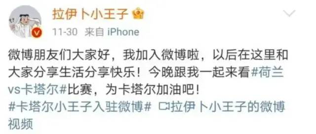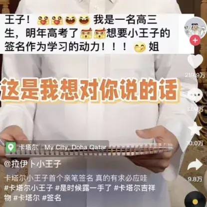 小王子本人對此倒是不客氣,對一干熱度照單全收,還熱情地錄製視頻,磕磕絆絆地向中國粉絲們喊話“我愛你們”,“歡迎你們來卡塔爾”。