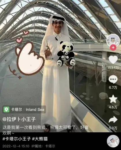 他還聽從粉絲的請求,去看旅居卡塔爾的中國熊貓四海和京京,準確拿捏的中國粉絲的心態。