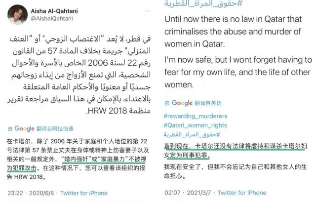 一位反抗者指出,卡塔爾沒有任何條款,將虐待和謀殺卡塔爾婦女定為行事犯罪,包括“婚內強姦”、“家庭暴力”都不會被認為是犯罪攻擊。