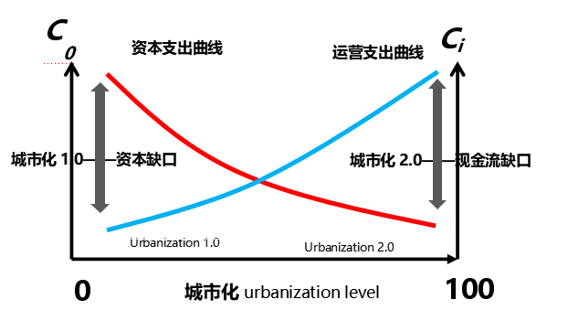 基於以上分析,可以得出一個結論——中國空間城市化的第一階段已經接近尾聲。**那麼接下來需要回答的問題就是,即將進入的城市化2.0階段的發展特點是什麼?**土地金融是否還可以發揮在城市化1.0階段所產生的類似的作用?圖2顯示的是城市化從0到100這個過程中,地方政府提供公共(產品)服務成本的變化,在城市化初期階段,地方政府投資基礎設施的資金缺口特別大,此時只要能獲得資本,城市就可以實現快速發展。土地金融正好滿足了這階段地方政府的融資一需求。**但一旦城市化進入下半場後,城市的基礎設施已經基本建成,此時地方政府的投資需求也將隨之下降。**由於在城市化的上半場(資本型增長階段),地方政府的固投增長非常快,所以一旦城市化進入下半場(運營型增長階段),地方政府的固投也會下降的非常陡,很多地方政府發現原來的高速增長的經濟突然失去了動力。