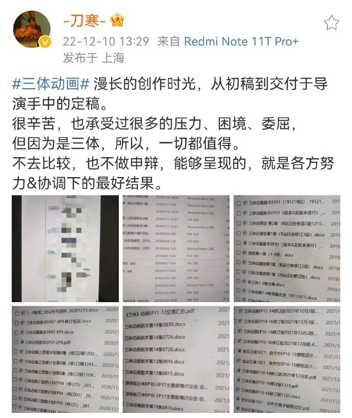 這三年來,經常看到同行編劇顧奕@-刀寒- ,在我們編劇羣裏聊《三體》的改編,他也曾幾度借住在我海南的房子裏閉關創作,我和很多羣友都見證了他這三年的辛苦付出。