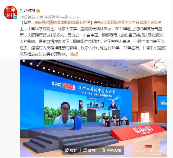 @生命時報:在2023環球時報年會生命健康分論壇上,中國科學院院士、北京大學第六醫院院長陸林表示,2020年世衞組織年度報告顯示,失眠障礙超過1億多人,五分之一來自中國。抑鬱症帶來的傷害已經超過冠心病對人的影響。目前疫情衝擊波下,即使陽性變陰性,對於有些人來説,心理衝擊也許不會過去。疫情對人類精神健康的影響,保守估計可能達到10年~20年左右。目前我們應該採取措施應對這類心理影響。